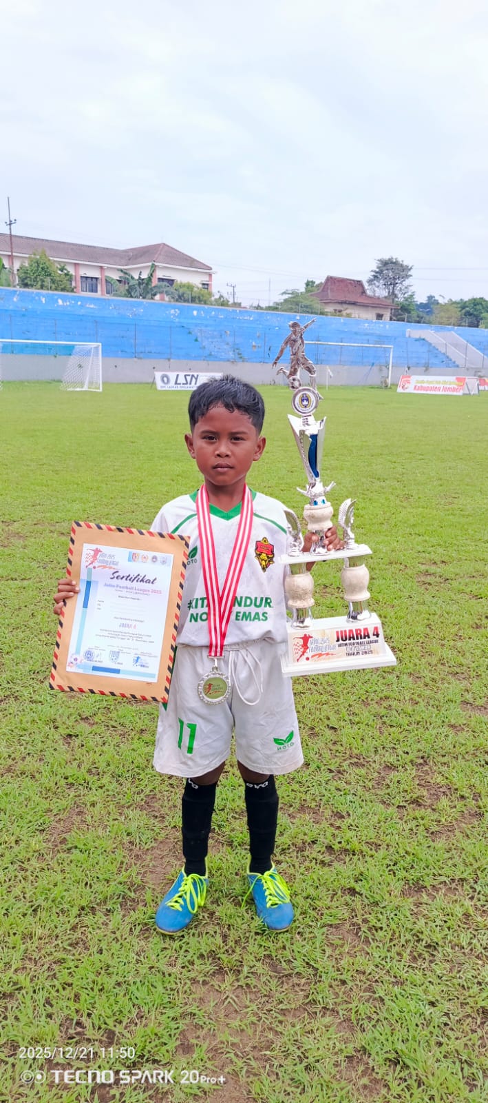 Jember – Puncak kemeriahan perayaan juara Semi Final dan empat besar sepak bola usia dini berlangsung meriah di Stadion Notohadinegoro, Jalan Dr. Soebandi, Kelurahan Kreongan Atas, Jember Lor, Kecamatan Patrang, Kabupaten Jember, Minggu (21/12/2025). Ribuan sorak sorai mewarnai lapangan saat para pemain belia merayakan keberhasilan mereka di ajang JATIM Football League 2025.
